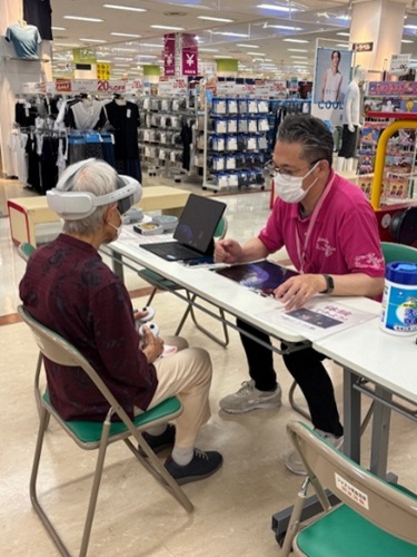 専用のゴーグルを着けたVR(バーチャル・リアリティ)の体験や、握力測定をおこないました。VRは、ゴーグルを着けた瞬間、周りに宇宙空間が広がり、飛んでくる隕石を狙い撃つ、ところどころに現れては消える白い点が見えたら知らせるという二つのアクションを、左右のコントローラーをそれぞれ使用して行います。初めは両手別々の操作に戸惑う方もいらっしゃいましたが、皆さん楽しんでいただけたようでした。