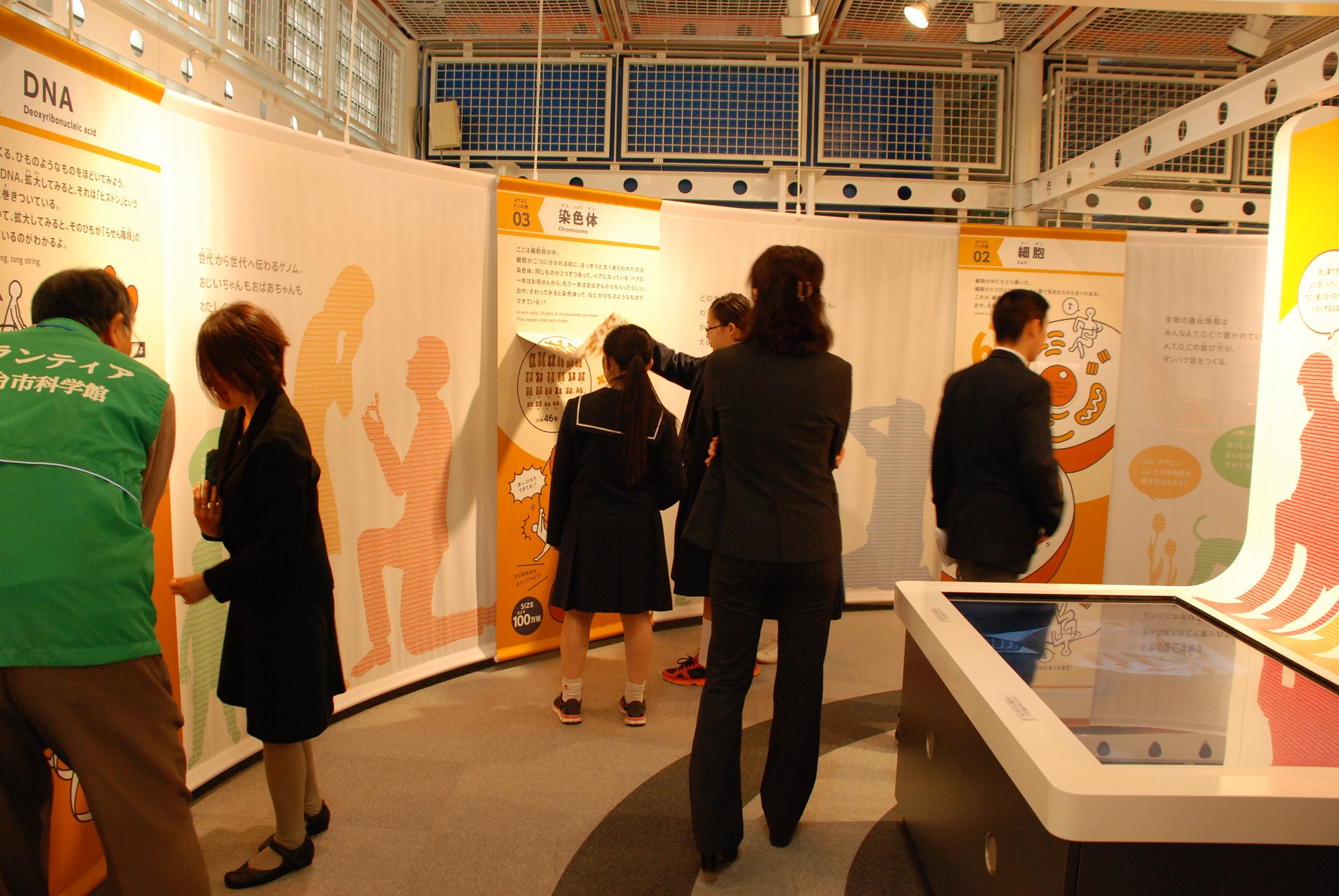 展示は、ヒトの体の細胞、染色体について、またDNAやゲノムなどについて、視覚的に分かりやすい解説で紹介するとともに、一人ひとりに合わせた次世代型医療について大型のタッチパネルゲームで体験できる内容になっています。